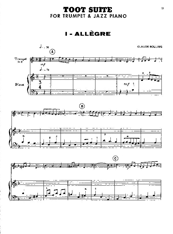 Toot Suite transcribed for the jazz piano of Claude Bolling as well as the solo trumpet of world-renowned player Maurice Andre. Includes bass and drum parts.