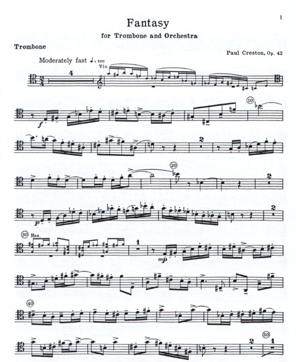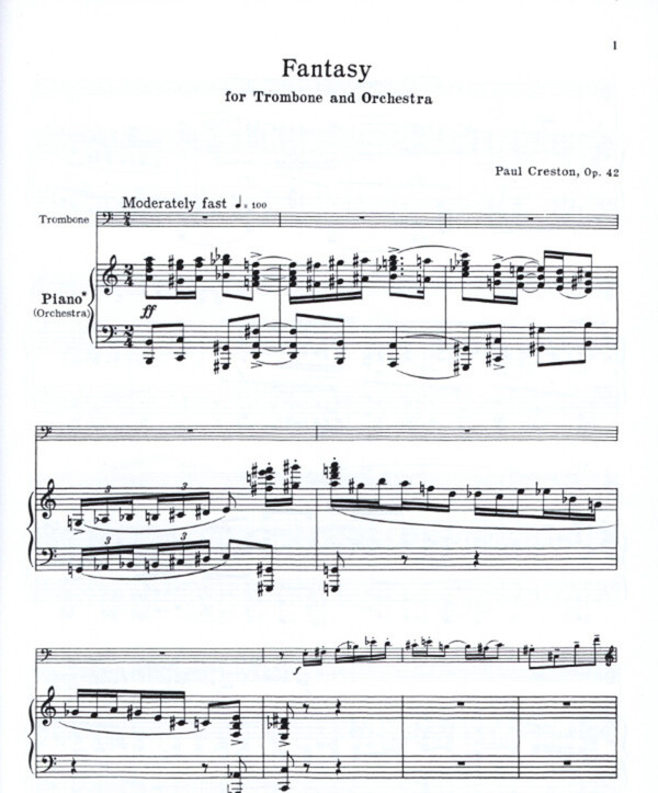 For trombone and concert band (piano reduction). Creston (1906-1985) was an American composer, known for his rhythmic intricacies.