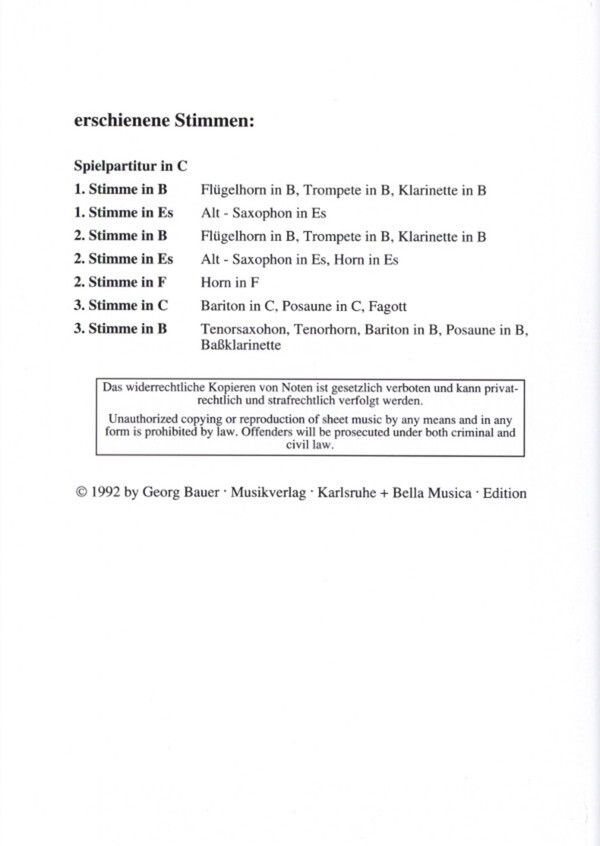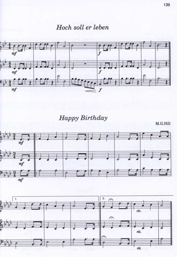 (ca. 150 Titel, mit: Abendchor: Schon die Abendglocken klangen - Abendglöckchen - Abendlied - Vulpius: Ach bleib mit deiner Gnade - Ade zur guten Nacht - Silcher: Ännchen von Tharau - Alle Jahre wieder - Liliuokalani: Alo Ahe - Als wir jüngst in Regensburg waren - Alter Jägermarsch - Strauß: Annen-Polka op.117 - Auf, auf zum fröhlichen Jagen - Auf der schwäbische Eisenbahne - Auld Lang Syne - Radecke: Aus der Jugendzeit - Mozart: Bald prangt den Morgen zu verkünden - Beim Kronenwirt - Bier her! - Bierwalzer - Birkenstoana Glöckerl - Boarischer - Boxhamerisch - Wagner: Brautchor aus "Lohengrin" - Mozart: Bundeslied - Der alte Berner Marsch - Schumann: Der fröhliche Landmann - Der Häuslratz - Der Herr ist meine Zuversicht - Friedrich II: Der Hohenfriedberger Marsch - Der Jäger aus Kurpfalz - Der Jäger in dem grünen Wald - Lyra: Der Mai ist gekommen - Schulz: Der Mond ist aufgegangen - Der Petersburger Marsch - Abt: Die Abendglocken rufen - Schäffer: Die Post im Walde - Dixie Time - Down By The Riverside - 3 Zwiefache - Du, du liegst mir am Herzen - Eine Seefahrt die ist lustig - Ein Prosit - Eisenkeilnest - Es ist ein Ros entsprungen - Es wird scho gleich dumpa - Ferstl: Fanfare - Groos: Freiheit - Freut euch des Lebens - Gaudeamus igitur - Gluck: Gebet - Geh'n wir mal rüber - Gloria in excelsis - Good Night, Ladies - Go, Tell It On The Mountain - Mendelssohn: Gottes Rat und Scheiden - Beneken: Grablied "Wie sie so sanft ruh'n" - Hallstäster Hochzeitsmarsch - Hamburger Veermaster - Hamburg ist ein schönes Städtchen - Hannover Garde du Corps Marsch - Hill: Happy Birthday - Heidschi Bumbeidschi - Heilig - Schubert: Heilig, heilig - Heut' geht es an Bord - Hinaus in die Ferne - Hoch soll er leben - Honakischer - Horch was kommt von draußen rein - Bortniansky: Hymne - Bortniansky: Ich bete an die Macht der Liebe - Ich bin ein freier Wildbretschütz - Ich din der Doktor Eisenbart - Ich hatt' einen Kameraden - Ihr Kinderlein kommet - Im schönsten Wiesengrunde - Integer vitae - Jetzt kommen die lustigen Tage - John Brown's Body - Joshua Fit The Battle Of Jericho - Keinen Tropfen im Becher mehr - Kling, Glöckchen, kling! - Kommet, ihr Hirten - Kreuzfahrer Hymne - Kuckuckspolka - Landler! - Yradier: La Paloma - Lasst uns froh und munter sein - Little Brown Jug - Lobe den Herren - Rolle: Lobgesang - Mädle ruck, ruck, ruck an meine grüne Seite - Mariechen saß weinend im Garten - Marsch - Mei Hut der hat drei Ecken - Michael, Row The Boat Ashore - Gade: Morgengesang - Kreutzer: Morgenlied - Morgen muß ich fort von hier - Muß i denn zum Städtele hinaus - Mendelssohn: Neujahrslied - Nobody Knows - Byrd: Non nobis, Domine - Nun ade, du mein lieb Heimatland - O alte Burschenherrlichkeit - Odenwald-Walzer - O du fröhliche - O du lieber Augustin - Oh Susanna - Old McDonald Had A Farm - Old Zipp Coon - Abt: O Schwarzwald, o Heimat - O Tannenbaum - Polly-Wolly-Doodle -. Rheinländer - Rheinländer aus Vorarlberg - Sabinchen war ein Frauenzimmer - Sandmännchen - Kreutzer: Schäfer's Sonntagslied - Schnacklwalzer - Koschat: Schneewalzer - Schön ist die Jugend - Kreutzer: Schon die Abendglocken klangen - Schottisch - Spohr: Selig sind die Toten - So nimm denn ,meine Hände - Sterzinger Andachtsjodler - Stille Nacht - Still, still, still - Strohschneider - Studio auf einer Reis - Tanzwalzer - The Camptown Races - Joplin: The Entertainer - The Girl I Left Behind - Sousa: The Stars And Stripes - The Yankee Doodle - Tiroler Polka - Tiroler Plattler - Händel: Tochter Zion - Beethoven: Trauergesang - Trauntaler - Lützel: Trauungshymne - Tusch - Tuschpolka - Kuhlau: Über allen Gipfeln ist Ruh' - Über den Sternen - Mozart: Üb immer Treu und Redlichkeit - Und da woll'n wir noch einmal - Vier Zünftige! - Vom Himmel hoch, da komm ich her - Waldeslust - Klauer: Wanderlied - Weißbacher - Wem Gott will rechte Gunst erweisen - When The Saints - Schrammel: Wien bleibt Wien - Beneken: Wie sie so sanft ruh'n - Wintergrün - Wohlauf noch getrunken, teilweise potpourri-artig, mit Ringmechanik)