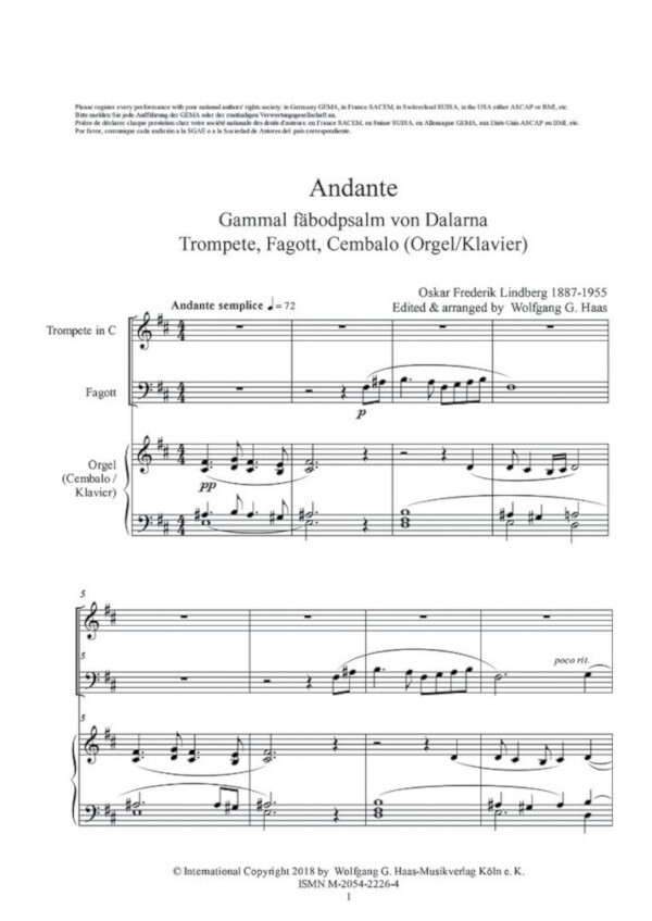 Oskar Frederik Lindberg war Komponist und Kirchenmusiker, schrieb spätromantische Orchesterstücke, ein Requiem, Kantaten und Hymnen. Er half dabei, das Material für das "Schwedische Hymnenbuch" von 1939 und das Messbuch von 1942 zusammen zu tragen. 14 Choräle sind von ihm erhalten. Hervortretende kompositorische Züge Lindbergs sind seine intensiv singende Melodik und ein harmonische und instrumentale Farbigkeit. Gerne verwendet er aus seiner heimatlichen Landschaft kommendes Melodiegut.