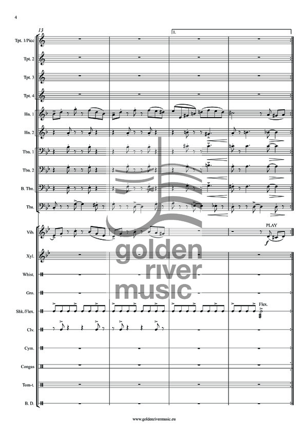 for large brass ensemble: 4tpt/2hn/3tbn/tuba/10perc Trompeten, 2 Hörner, 3 Posaunen, Tuba und 10 Percussion
