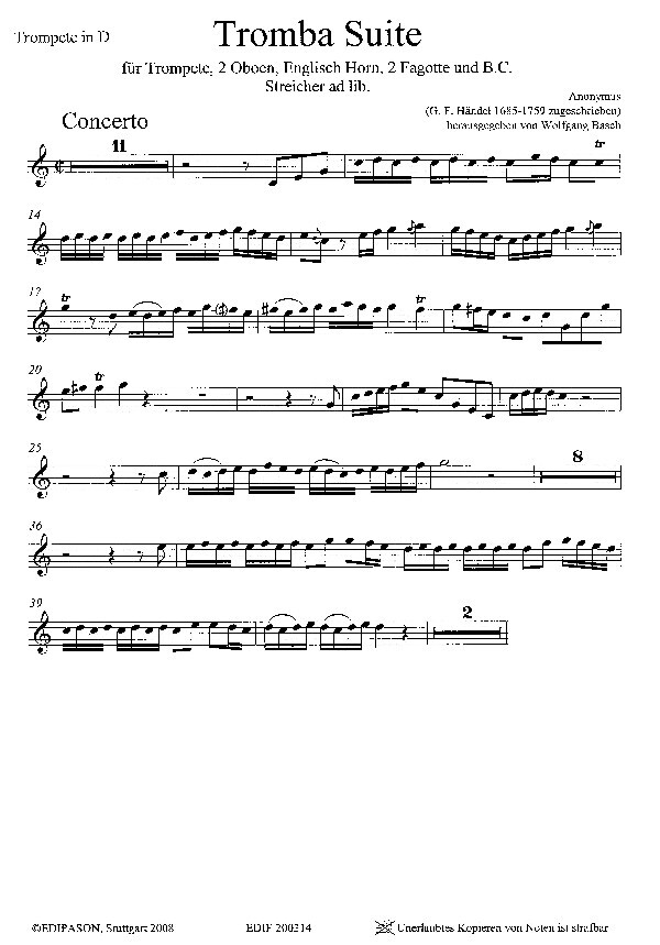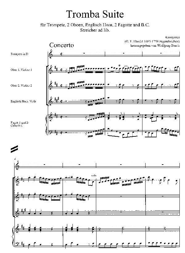 für Trompete in C/D, 2 Oboen, Englisch Horn, 2 Fagotte + B.c., Streicher ad libitum
