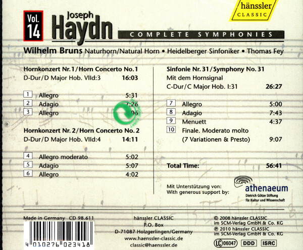 Heidelberger Sinfoniker - Dir.: Fey Haydn: Hornkonzert Nr.1 D-Dur Hob. VIId:3 Haydn: Hornkonzert Nr.2 D-Dur Hob. VIId:4 Haydn: Sinfonie Nr.31 "Mit dem Hornsignal" C-Dur Hob. I:31 CD
