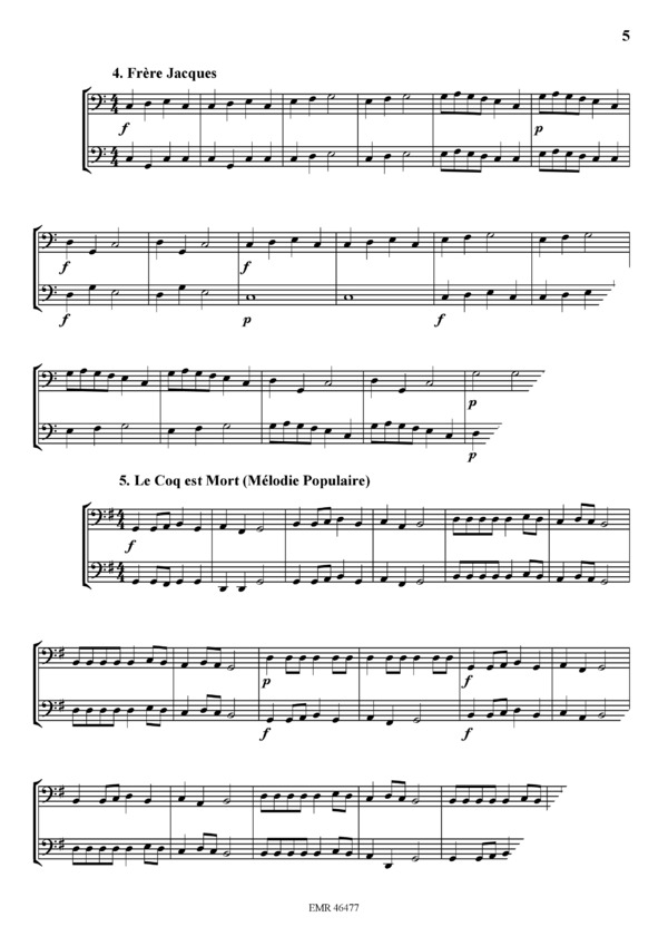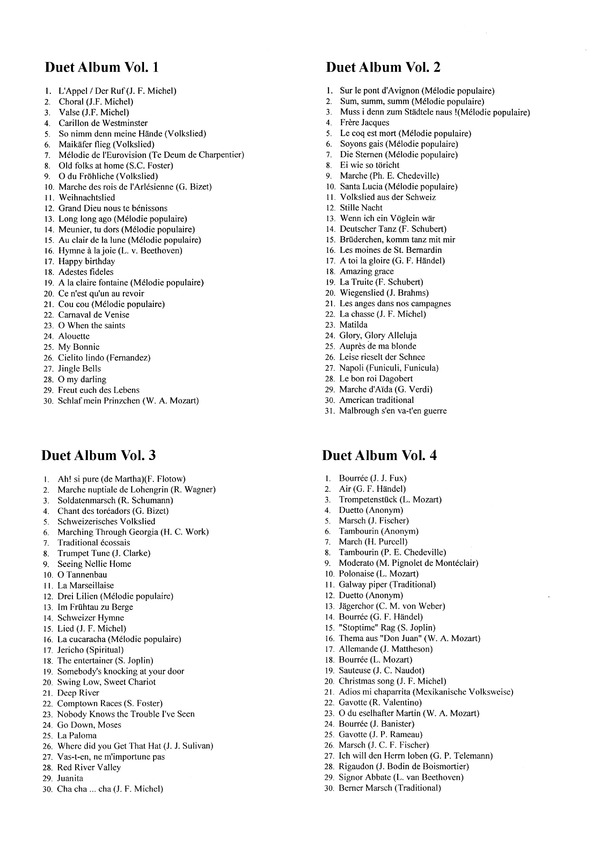 1. Sur le pont d'Avignon (Mélodie populaire) / 2. Sum, summ, summ (Mélodie populaire) / 3. Muss i denn zum Stadtele naus !(Mélodie populaire) / 4. Frčre Jacques / 5. Le coq est mort (Mélodie populaire) / 6. Soyons gais (Mélodie populaire) / 7. Die Sternen (Mélodie populaire) / 8. Ei wie so tôricht / 9. Marche (Ph. E. Chedeville) / 10. Santa Lucia (Mélodie populaire) / 11. Volkslied aus der Schweiz / 12. Stille Nacht / 13. Wenn ich ein Vôglein war / 14. Deutscher Tanz (F. Schubert) / 15. Brüderchen, komm tanz mit mir / 16. Les moines de St. Bernardin / 17. A toi la gloire (G. F. Handel) / 18. Amazing grace / 19. La Truite (F. Schubert) / 20. Wiegenslied (J. Brahms) / 21. Les anges dans nos campagnes / 22. La chasse (J. F. Michel) / 23. Matilda / 24. Glory, Glory Alleluja / 25. Auprčs de ma blonde / 26. Leise rieselt der Schnee / 27. Napoli (Funiculi, Funicula) / 28. Le bon roi Dagobert / 29. Marche d'Aďda (G. Verdi) / 30. American traditional / 31. Malbrough s'en va-t'en guerre