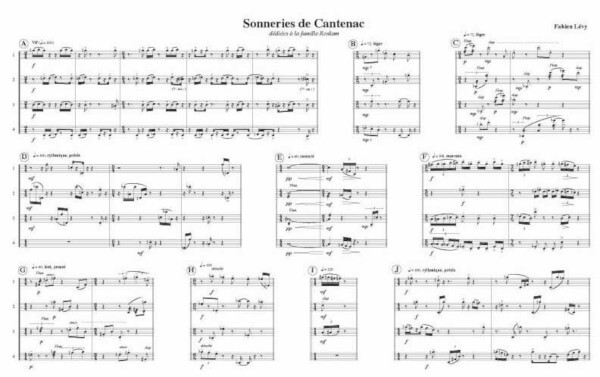 Das Stück, das aus 26 unabhängigen Abschnitten (Sonneries) besteht, soll vor oder/und nach dem Konzert gespielt werden, während die Zuhörer ankommen oder gehen. Die Musikern befinden sich außerhalb des Konzertsaals (in den Gängen, im Garten, auf dem Parkplatz, in der U-Bahn Station etc.). Die Musiker spielen an versteckten Orten, an denen das Publikum sie nicht sehen kann. Eine andere Möglichkeit ist für die Musiker durch das Publikum zu wandern, (mit dem Synchronizationssoftware auf einem Smartphone, oder mit einem kabellos Kopfhörer, um die Klick zu folgen).