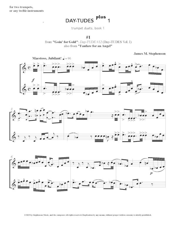 Furthermore, I tried to vary them up, with (mostly) different key signatures and different styles, ranging from fanfares to lyrical, and from quasi-Bach to modern Latin music. The intent there is that each page turn reveals a new surprise, and adds to the enjoyment. The last duet is even in the dominant key of the first, in case the players want to just jump right back to the beginning of the book again, and repeat them all!"