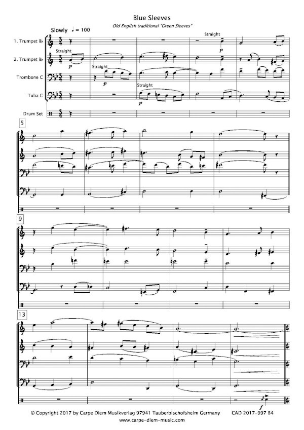 "Green Sleeves" als jazziges Arrangement für Blechbläserquartett 2 Trompeten in Bb 1 Posaunen in C/B 1 Tuba in C/Bb/ Eb Dauer:3:20 min