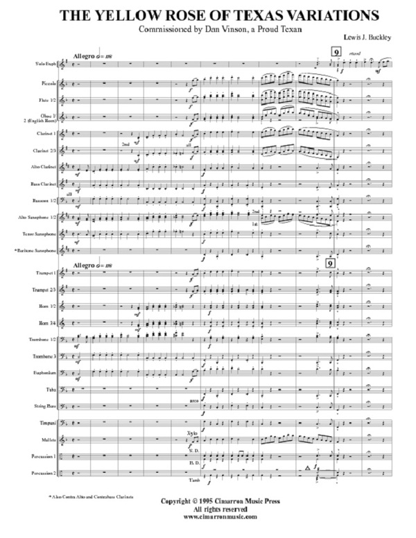 Sol o-Euphonium im Violinschlüssel + Blasorchester (Piccoloflöte, 2 Flöten, 2 Ob oen (2. Oboa auch Englischhorn), 3 Klarinetten, Alt-Klarinete, Bassklarinette, 2 Fagotte, 2 Altsaxophone, Tenorsaxophon, Baritonsaxophon, 3 Trompeten, 4 Hörner, 3 Posaunen, Euphonium, Tuba, Kontrabass, Pauken, Mallets + 2 Percussion)
