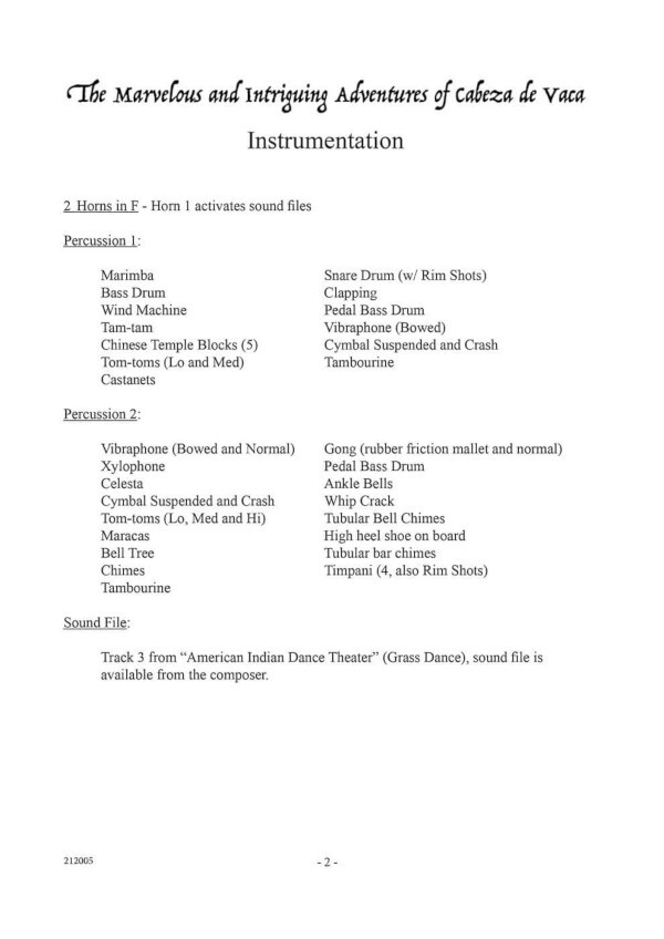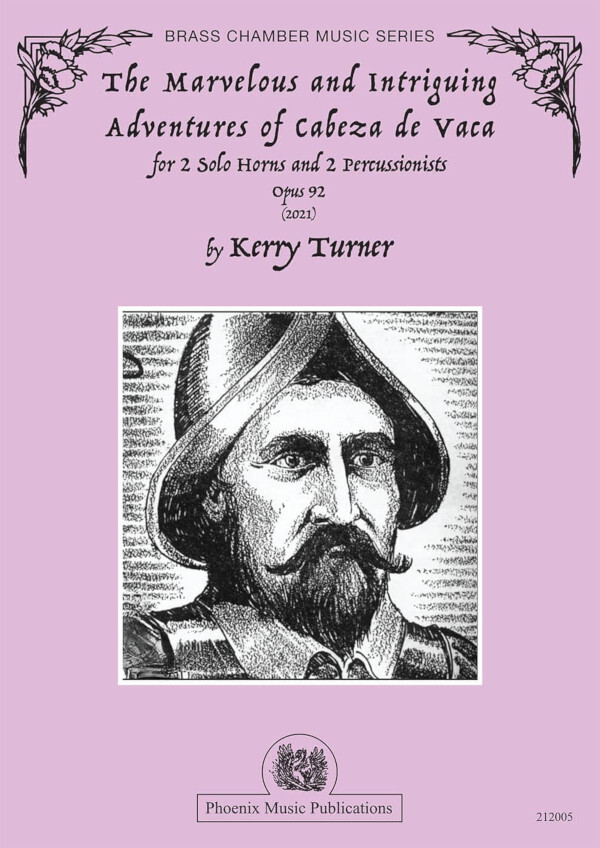 Cabeza de VacaThis composition is a musical impression of the book La relación y comentarios. This translates as The Account and Commentaries, written by the famous explorer and anthropologist Alvar Nuñez Cabeza de Vaca. He was one of four survivors of the 1527 Narvaez Expedition, which shipwrecked off the Texas Gulf Coast around Matagorda Bay. In his book, he tells how the local Karankawa and Coahuiltecan Indians kidnapped and enslaved his group for four years. During this time, he discovered that he had a strange gift of healing. He quickly distinguished himself (and thereby saving himself and the others) by healing sick and wounded Native Americans from all over the Texas area. Eventually the healer-explorer found an opportunity to escape. He, with his comrades, fled West into New Spain, which is modern-day Mexico. For more information about this amazing story, click here.Musical DescriptionThe tone poem begins with a dramatic opening followed by the sounds of the untamed Texas Gulf Coast. Afterwards, the first strains of the works main theme appear. Then the unmistakable Spanish sounds of Cabeza de Vacas theme segue the piece into the introduction of the Karankawa encounter and the explorers enslavement. Soon, Cabeza de Vaca discovers his unworldly gift of healing, and becomes revered as a miracle worker. Seeing a sudden opportunity to escape, he and his compatriots flee and make their way down to Mexico.CommissionTAMUK Horn Society and the 54th International Horn Symposium in Kingsville, Texas commissioned this work. Additionally, by way of connection, Cabeza de Vaca passed very close to Kingsville, Texas en route to Mexico. Also, to close the connection, Kerry Turner was born in 1960 in Kingsville.OriginsCabeza de Vaca was composed in Perdonone, Italy and Brussels, Belgium in November, 2021. Although it is written for only two percussionists, it can also be performed more easily by adding extra players.