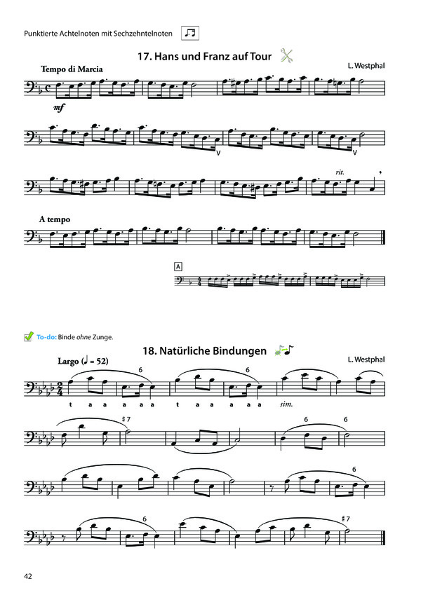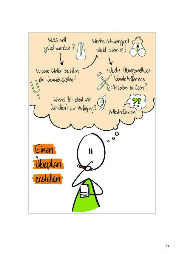 Übeplan und Praxistipps für eigenständiges Lernen Methodische Piktogramme, die den Hauptschwerpunkt eines Stückes oder einer Übung anzeigen